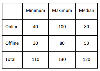 Comprehension: In a coaching class, some students register online, and some others register offline. No student registers both online and offline; hence the total registration number is the sum of online and offline registrations. The following facts and table pertain to these registration numbers for the five months – January to May of 2023. The table shows the minimum, maximum, median registration numbers of these five months, separately for online, offline and total number of registrations. The following additional facts are known. 1. In every month, both online and offline registration numbers were multiples of 10 . 2. In January, the number of offline registrations was twice that of online registrations. 3. In April, the number of online registrations was twice that of offline registrations. 4. The number of online registrations in March was the same as the number of offline registrations in February. 5. The number of online registrations was the largest in May